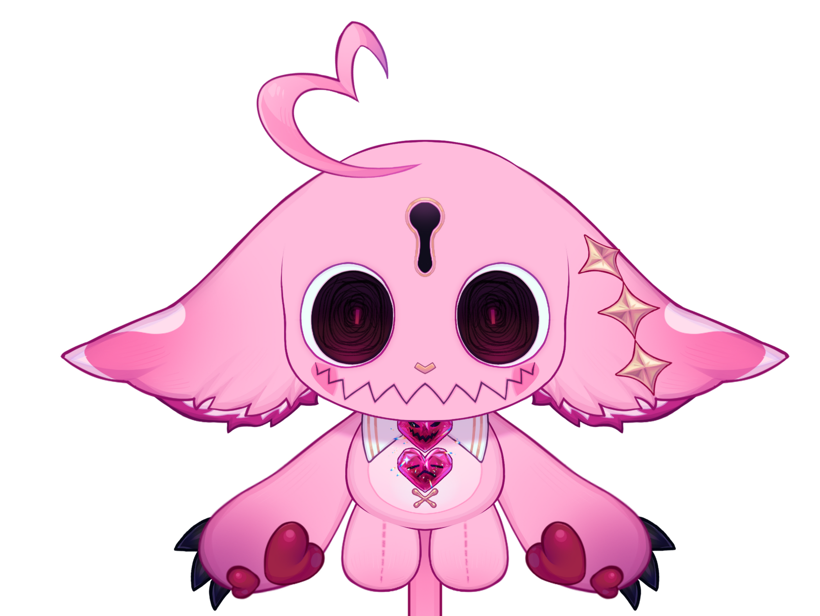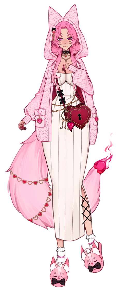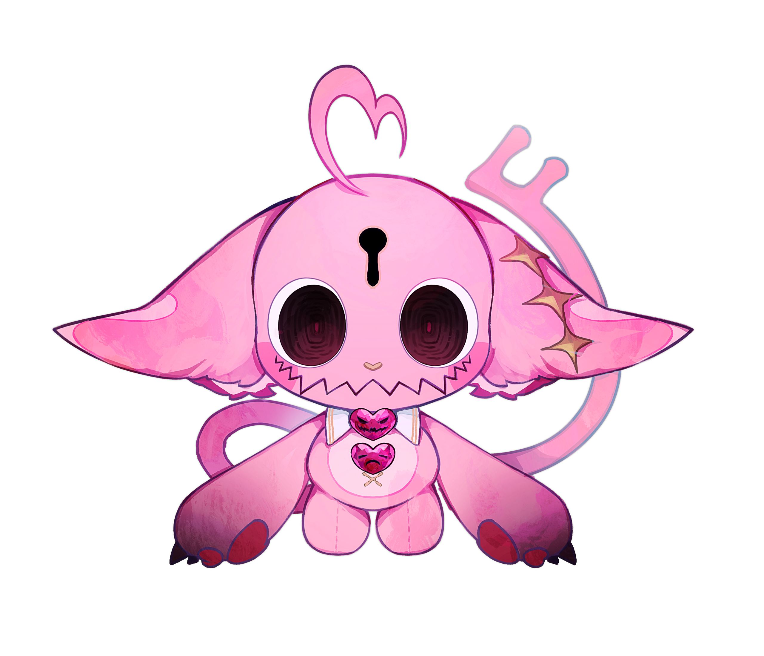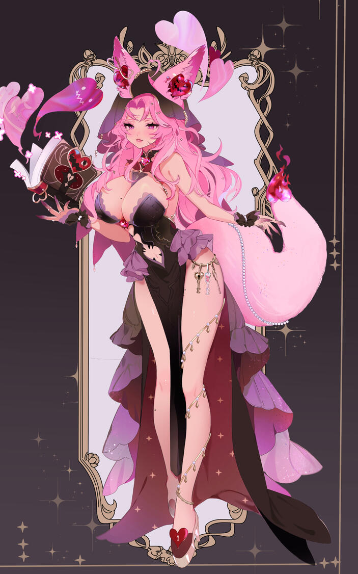 Before she can think about the sudden coolness underneath her, she is blown across the stone floor by the force of the storm’s winds, the key and stones clinking as they blew out of Shae’s grip. She quickly looks up, squinting against the pelting sand and dust and sees a curious sight; a rectangular cutout of a violent desert storm floating against a veil of darkness as if it were a living framed painting amongst a static wall.However, just as quickly as she had fallen, the cutout vanished; the howling winds silenced and the blown sand sat in piles on the stone floor in a dark hall with the only light coming from the three gems Shae had found, scattered across the floor. Quickly she had gathered the gems, using their faint glow as a light source, and slowly leaned herself back against a large stone pillar that stood in one of two rows inside of a giant hallway. Sinking to the ground as the fatigue of the day’s events had finally taken their toll, and our hero Shae, had closed her eyes and drifted off into a deep sleep.The next day saw the giant stone hallway slightly more illuminated if just barely as a soft white light from the stars in the dark sky peered their way through the large windows of the vast hallway. Shae snapped awake, quickly standing up and checking her surroundings before calming herself down and realizing that what she had experienced was indeed not a dream. She sighed as her stomach grumbled, her throat parched. She couldn’t stay in that hallway forever so she set off to explore this mysterious building, hoping to find a way home, or at the very least something to eat.She made her way towards the end of a hallway and came upon a large ornate door double her size, nestled into an equally ornate doorway carved into the stone wall. The lacquered wood felt smooth against her hand but stayed firm against her push. She pushed with both hands, then her shoulder and eventually rammed her whole body against the door: nothing. The door stood firm, and locked. Coincidentally, as Shae examined the door, she noticed a small keyhole just within her reach, and while tiny when compared to the door itself, seemed to perfectly house the mysterious key in her arms. She pressed in into the keyhole and turned and with a loud and low groan, the door slowly swung open, revealing a large and vast library with its numerous shelves each filled thoroughly with countless books.Shae slowly made her way towards one of the shelves and set her gems down as she grabbed the nearest book and began flipping through its pages. “I can’t read any of this.” Shae thought as the letters on the page looked like nothing but gibberish to her. However, the nearby gems began to radiate a familiar pink glow and the letters in the book began to glow with them, aligning and rearranging themselves until they resembled something Shae could read. “Some Light Please” Shae muttered under her breath before a flurry of orbs rushed out of the book and spread throughout the ceiling of the library, a warm, candle-like light emanating from them, illuminating the entire library with their warm light as Shae strained her eyes, adjusting to the sudden illumination.However with the new light, Shae looked at the book she had grabbed and noticed that the letters were not the only thing that had changed, as the book began to morph and wriggle as it contorted itself into numerous shapes and forms. Surprised, Shae dropped the wriggling mass to the floor and slowly backed away from it. Unfazed, the book kept writhing and slithering until it transformed from a normal leatherbound book into a black and pink grimoire: with black leather and dark metal plating adorning its covers with pink leather and gems emblazoned on its front cover.It took Shae a moment before she decided to brave picking the book back up again but when she did, she noticed that the lettering was once again illegible, but would begin glowing and rearranging themselves whenever Shae picked up the book. “...summ…on…me….ple….ease…” Shae heard a familiar voice call out to her from the book. “...I….can…..help….” she heard again. Shae shook her head as she began to close the book. She stopped however, remembering that the same voice had saved her earlier from the sandstorm. She wasn’t sure if she could trust that voice, but she was tired and hungry and thirsty and lost in an unknown building in who knows where. Shae decided to take a chance and trust this voice. “Okay, how do?” Shae asked outloud, not sure if the voice can hear her. “...Like the lights…. Just ask and say please….” it replied. “Okay” Shae breathed. “Let’s meet, please!”The book began to tremble and fell to the ground as a large spiral of dust and sparkles and light shot out from its pages. The magic whipped the books off of the shelves and whipped Shae’s hair all over as a bright gold light shone from the book. THe light began to change color as a small silhouette of pink light began to rise from the pages of the book, its head and ears large, with long arms and a longer tail attached to a short body with stubby legs. Once the silhouette had risen high above the grimoire, the pink glow shattered and small flecks of light sparkled in the air as the silhouette had been replaced with a small, soft, pink creature. The creature floated for a moment before turning midair and setting its eyes upon Shae. Its eyes were large with dark spirals for irises and it had a large jagged jaw for a mouth and a keyhole centered on its large head. Suddenly, the creature stopped floating and dropped onto the grimoire, back first with a loud thud and a small, stifled “ow.”“Finally!” the creature said suddenly, pumping its fists into the air triumphantly, still lying down on the ground before sitting up. “Do you know how long I’ve been waiting for someone to find these things?” the creature said as it picked up the two gems and key from the ground in its 