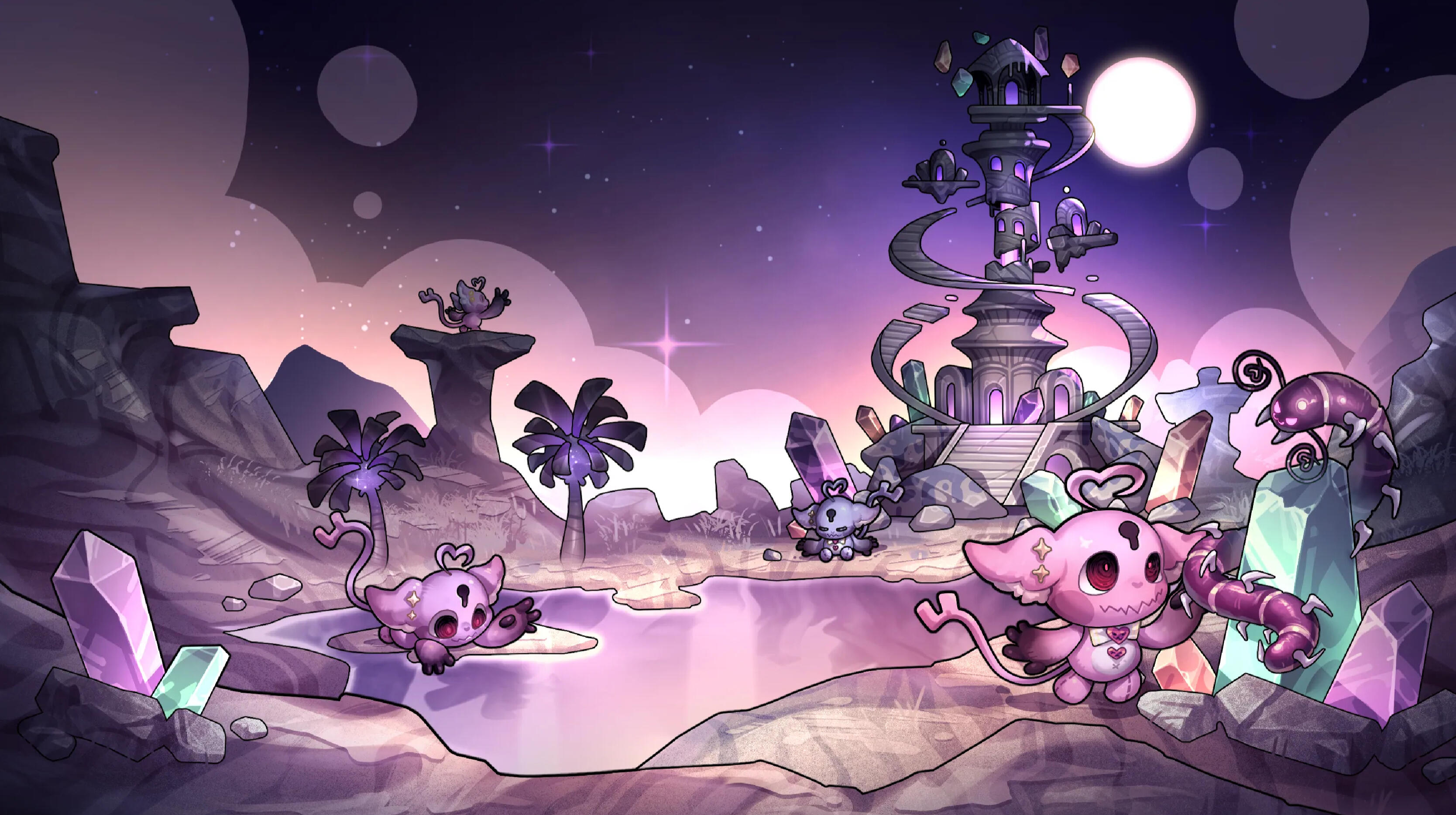 Before she can think about the sudden coolness underneath her, she is blown across the stone floor by the force of the storm’s winds, the key and stones clinking as they blew out of Shae’s grip. She quickly looks up, squinting against the pelting sand and dust and sees a curious sight; a rectangular cutout of a violent desert storm floating against a veil of darkness as if it were a living framed painting amongst a static wall.However, just as quickly as she had fallen, the cutout vanished; the howling winds silenced and the blown sand sat in piles on the stone floor in a dark hall with the only light coming from the three gems Shae had found, scattered across the floor. Quickly she had gathered the gems, using their faint glow as a light source, and slowly leaned herself back against a large stone pillar that stood in one of two rows inside of a giant hallway. Sinking to the ground as the fatigue of the day’s events had finally taken their toll, and our hero Shae, had closed her eyes and drifted off into a deep sleep.The next day saw the giant stone hallway slightly more illuminated if just barely as a soft white light from the stars in the dark sky peered their way through the large windows of the vast hallway. Shae snapped awake, quickly standing up and checking her surroundings before calming herself down and realizing that what she had experienced was indeed not a dream. She sighed as her stomach grumbled, her throat parched. She couldn’t stay in that hallway forever so she set off to explore this mysterious building, hoping to find a way home, or at the very least something to eat.She made her way towards the end of a hallway and came upon a large ornate door double her size, nestled into an equally ornate doorway carved into the stone wall. The lacquered wood felt smooth against her hand but stayed firm against her push. She pushed with both hands, then her shoulder and eventually rammed her whole body against the door: nothing. The door stood firm, and locked. Coincidentally, as Shae examined the door, she noticed a small keyhole just within her reach, and while tiny when compared to the door itself, seemed to perfectly house the mysterious key in her arms. She pressed in into the keyhole and turned and with a loud and low groan, the door slowly swung open, revealing a large and vast library with its numerous shelves each filled thoroughly with countless books.Shae slowly made her way towards one of the shelves and set her gems down as she grabbed the nearest book and began flipping through its pages. “I can’t read any of this.” Shae thought as the letters on the page looked like nothing but gibberish to her. However, the nearby gems began to radiate a familiar pink glow and the letters in the book began to glow with them, aligning and rearranging themselves until they resembled something Shae could read. “Some Light Please” Shae muttered under her breath before a flurry of orbs rushed out of the book and spread throughout the ceiling of the library, a warm, candle-like light emanating from them, illuminating the entire library with their warm light as Shae strained her eyes, adjusting to the sudden illumination.However with the new light, Shae looked at the book she had grabbed and noticed that the letters were not the only thing that had changed, as the book began to morph and wriggle as it contorted itself into numerous shapes and forms. Surprised, Shae dropped the wriggling mass to the floor and slowly backed away from it. Unfazed, the book kept writhing and slithering until it transformed from a normal leatherbound book into a black and pink grimoire: with black leather and dark metal plating adorning its covers with pink leather and gems emblazoned on its front cover.It took Shae a moment before she decided to brave picking the book back up again but when she did, she noticed that the lettering was once again illegible, but would begin glowing and rearranging themselves whenever Shae picked up the book. “...summ…on…me….ple….ease…” Shae heard a familiar voice call out to her from the book. “...I….can…..help….” she heard again. Shae shook her head as she began to close the book. She stopped however, remembering that the same voice had saved her earlier from the sandstorm. She wasn’t sure if she could trust that voice, but she was tired and hungry and thirsty and lost in an unknown building in who knows where. Shae decided to take a chance and trust this voice. “Okay, how do?” Shae asked outloud, not sure if the voice can hear her. “...Like the lights…. Just ask and say please….” it replied. “Okay” Shae breathed. “Let’s meet, please!”The book began to tremble and fell to the ground as a large spiral of dust and sparkles and light shot out from its pages. The magic whipped the books off of the shelves and whipped Shae’s hair all over as a bright gold light shone from the book. THe light began to change color as a small silhouette of pink light began to rise from the pages of the book, its head and ears large, with long arms and a longer tail attached to a short body with stubby legs. Once the silhouette had risen high above the grimoire, the pink glow shattered and small flecks of light sparkled in the air as the silhouette had been replaced with a small, soft, pink creature. The creature floated for a moment before turning midair and setting its eyes upon Shae. Its eyes were large with dark spirals for irises and it had a large jagged jaw for a mouth and a keyhole centered on its large head. Suddenly, the creature stopped floating and dropped onto the grimoire, back first with a loud thud and a small, stifled “ow.”“Finally!” the creature said suddenly, pumping its fists into the air triumphantly, still lying down on the ground before sitting up. “Do you know how long I’ve been waiting for someone to find these things?” the creature said as it picked up the two gems and key from the ground in its 